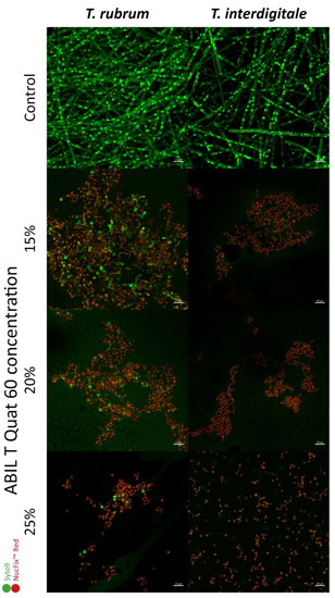 To visualize the effect of the polymers, a Live/Dead stain was used on microconidia that were incubated for 72 h, using the DNA-binding dyes SYTO9 and NucFix Red to distinguish between living (green) and dead (red) cells. Unfortunately, this technique did not work with Eudragit due to the high autofluorescence and/or binding of the fluorescent dyes to the polymer, so only results for ABIL are shown (Figure 5). In the absence of polymer, both Trichophyton spp. developed into mycelium with multinucleated hyphae (in green), which is characteristic of filamentous molds. In contrast, in samples treated with ABIL, the red colour of NucFix Red dominated, and most fungal material still had the appearance of microconidia. This indicated that most conidia did not germinate, had damaged membranes, and were therefore probably dead. In the presence of 15% ABIL, some conidia with germ tubes could be seen with T. rubrum, but with 20% or 25% ABIL these germ tubes disappeared, even though some microconidia still appeared alive. With T. interdigitale, any level of ABIL tested resulted in the complete killing of microconidia, as demonstrated by the absence of any green staining.