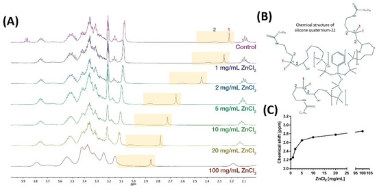 1H NMR titration study with 20% ABIL T Quat 60 and zinc chloride (1–100 mg/mL) in CD3OD. 1 and 2 represented the methyl group and the alkyl chain next to the amine group of ABIL. (A) Chemical shift induced by the chelation of zinc ion; (B) Chemical structure of ABIL; (C) Titration curve of the methyl group (1) of the amine group.