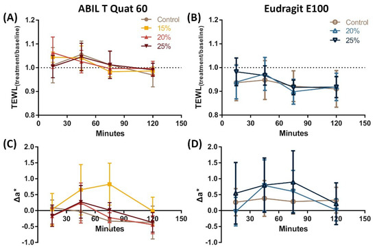 Evolution of TEWL (A,B) and skin redness (Δa*) (C,D) following application of polymeric film-forming systems to the forearm of healthy subjects: Films with ABIL (A,C) and films with Eudragit (B,D) (A–D: No significant differences found between treatments and control by Two-way RM ANOVA; subjects = 5).