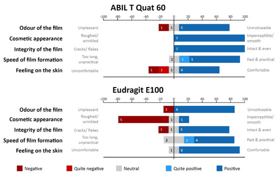 First, we measured TEWL and skin redness before and after application of films formed from 15 (only ABIL), 20 or 25% polymer in 95% ethanol and of the control (95% ethanol) formulations to the volar side of forearms of five healthy volunteers. Post-treatment skin redness and TEWL were measured for up to 2 h post-application and, as shown in Figure 8 for both ABIL and Eudragit, there were no statistically significant differences between the values measured for skin sites treated with the solvent control and the polymeric films. Secondly, seven volunteers scored the acceptability of the films regarding their odour, cosmetic appearance, integrity of the film, speed of film formation, and feeling on the skin (Figure 9). The general perception of ABIL films was positive, with only one participant disliking the odour and feeling on the skin. As for Eudragit, the response was similarly positive with the exception of the cosmetic appearance, which 3 of the 5 volunteers disliked. In fact, Eudragit films had a somewhat wrinkled look on the skin, and one participant commented that the dried Eudragit film “appeared to pull on hairs in the skin”. Overall, there was a preference for ABIL films because of their softer and smoother feeling on the skin as compared to Eudragit. In all cases, the films remained in place for the length of the study. ABIL films seemed to be easily removed by rinsing with water, whereas Eudragit films were more “water-resistant” and persistent, and their removal required several repeats of washing with water and soap.