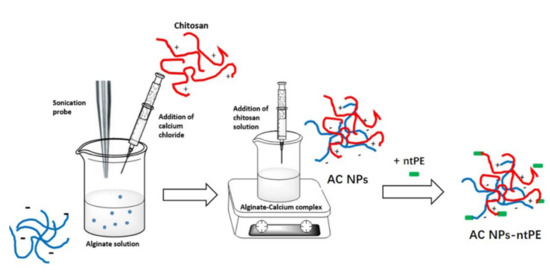 First, 2 mL of 0.51 mg/mL calcium chloride (Sigma-Aldrich, Gillinghamm, UK) solution was added to 10 mL of 0.06 mg/mL oxidized alginate solution dropwise under micro-tip probe ultra-sonication (Branson Sonifier Model 2501450, Branson, CT, USA). The resultant material was stirred for another 30 min before the addition of 2 mL of a 0.3 mg/mL aqueous chitosan solution (Sigma-Aldrich, UK) and the suspension equilibrated overnight at RT to allow the formation of NPs. The material was reacted with BSA-EMCH or ntPE-EMCH: 2 mL of these NPs were reacted with 0.5 mg of BSA-EMCH or ntPE-EMCH for 15 min at RT prior to the addition of 4 mg of EDC (1-ethyl-3-(3-dimethylaminopropyl) carbodiimide, Sigma-Aldrich, Gillinghamm, UK) and 5 mg of NHS (N-hydroxysuccinimide, Thermo Fisher Scientific, Runcorn, UK) to the reaction solution (Figure 1). After the addition of EDC and NHS, the pH was adjusted to 6.5 and the reaction was allowed to proceed at RT. After 2 h, unreacted protein and reagents were removed by overnight dialysis against water at RT (100 kDa, Spectra/Por® Biotech membranes, SpectrumLabs, New Brunswick, NJ, USA). The extent of protein coupling onto AC NPs was quantified using the Bradford assay ((Bio-Rad Laboratories, Hercules, CA, USA). After measuring the extent of labelling with ntPE or BSA, remaining aldehyde groups were reacted with an excess of the fluorescent dye Alexa Fluor® 546 (Ex/Em 490 nm/525 nm) to provide a label for visualization by fluorescence microscopy. GFP-loaded AC NPs were prepared by mixing 0.3 mg of GFP (prepared in lab following expression in E.coli [15]) with 2 mL of 0.3 mg/mL chitosan solution, and this mixture was added dropwise into the alginate–calcium complex.