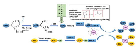First, 2 mg of ntPE-TEV-H6 protein was reacted with TEV enzyme (Life Technologies, Carlsbad, CA, USA) and a 1 mL HisTrap HP column was used to elute the cleaved protein (ntPE-CENLYFQ). A 5-fold molar excess of N-(ε-maleimidocaproic acid) hydrazide (EMCH) was reacted with ntPE at RT for 2 h prior to the removal of unreacted EMCH using dialysis (10 kDa MWCO) against PBS overnight at 4 °C. To prepare a control protein for coupling to NPs, a 3-fold molar excess of Traut’s reagent (5,5′-dithiobis(2-nitrobenzoic acid); Sigma-Aldrich, Gillinghamm, UK) was added to BSA in 12 mM PBS (pH 7.4) containing 3 mM EDTA and incubated at RT for 1 h to produce ~1 thiol group per BSA molecule prior to reaction with EMCH in a manner identical to that used for ntPE-CENLYFQ.
