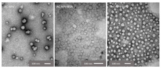 The biodegradable AC NPs were characterized by TEM and determined to have an average diameter of 48 ± 14 nm in the dehydrated state (Table 1, Figure 4). After conjugation with BSA-SH or ntPE-CENLYFQ, TEM analysis demonstrated that the particle diameters in the dehydrated state were similar to the unmodified particles: AC NPs-BSA had an average diameter of 48 ± 15 nm and AC NPs-ntPE had an average diameter of 46 ± 24 nm (Table 1; Figure 4). There was no suggestion of extensive aggregation for AC NPs-BSA or AC NPs-ntPE preparations examined under these conditions. While previous studies have suggested that the presence of proteins on the surface AC NPs might shield them from self-association by increasing their colloidal stability [17], this possibility was not experimentally tested in our studies. Particle size for AC NPs remained unchanged for 7 days in the simulated intestinal fluid (SIF, pH 6.8), the TEM images for AC NPs and NPs-PE was captured after dispersing them in SIF (pH 5.0, 6.8, or 7.0) for 15, 30, or 60 min. Under all these conditions, NPs were observed by TEM.