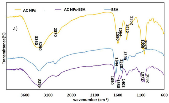 FTIR spectra were obtained by using a Perkin Elmer Frontier Optica FTIR spectrometer (Frontier, Perkin Elmer Ltd, Cambridge, UK) equipped with a mercury cadmium telluride detector. Buffer correction was carried out before each measurement. A drop of AC NPs, AC NPs-BSA and AC NPs-ntPE suspension was placed on the crystal and signals were obtained from 4000 to 600 cm−1 wavenumbers at a resolution of 4 cm−1.