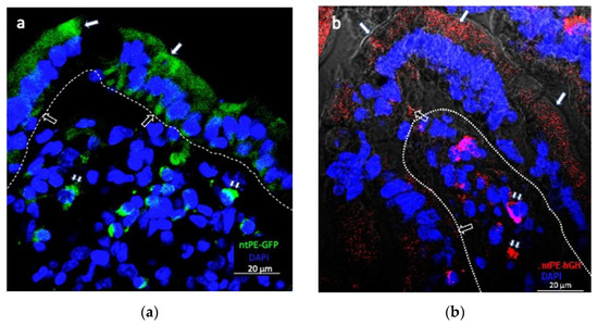 Representative confocal fluorescence image of (a) ntPE-GFP or (b) ntPE-hGH fate following intra-luminal injection (ILI) into rat jejunum. A non-toxic version of Pseudomonas aeruginosa exotoxin A (ntPE) genetically fused to green fluorescent protein (GFP) or human growth hormone (hGH) was examined for its tissue distribution at 15 min post-ILI. ntPE-GFP can be observed in vesicular structures within the apical region (solid arrow) and basal region of enterocytes of the epithelium. ntPE-GFP that has completed the transcytosis process can be seen in non-polarized cells within the lamina propria (small double solid arrows). Lamina propria-epithelium demarcation = dashed line. Nuclei were stained blue with DAPI. Scale bar = 10 µm.