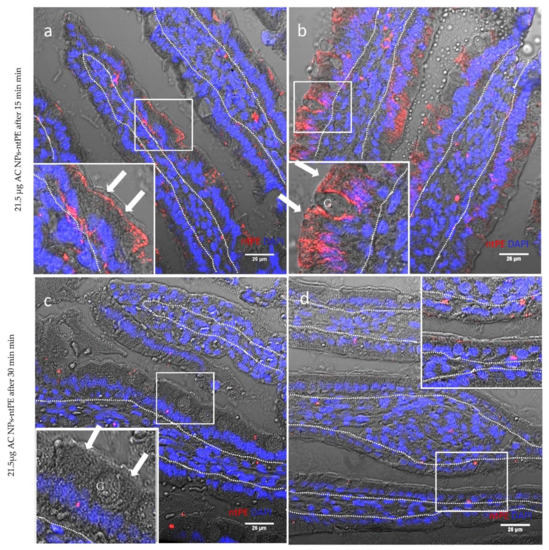 AC NPs prepared for these studies showed sufficient in vitro stability to allow for size determination, zeta potential measurement, and FTIR analysis. Thus, we believed that they would be sufficiently stable for in vivo testing and tested their uptake across rat intestinal epithelia using an intraluminal injection (ILI) method. Fluorescence microscopy was used to follow Alexa Fluor®® 546 that had been chemical coupled to ntPE prior to its conjugation onto the surface of AC NPs (AC NPs-ntPE*). At 15 min after intraluminal injection into rat jejunum, intestinal tissues were isolated and processed for microscopy following PBS washing to remove adherent luminal surface materials. At this time point, an extensive uptake of AC NPs-ntPE* into enterocytes and goblet cells was observed (Figure 7a,b). The cellular distribution of AC NPs-ntPE*) was similar to the previous observations that examined a biotinylated form of ntPE to transport across intact mouse nasal epithelium in vivo [21] and ntPE genetically linked to hGH (Figure 6a).