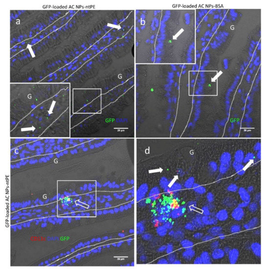 Representative confocal fluorescence images of intestinal villi following intra-luminal injection (ILI) into rat jejunum of test articles. (a) Green fluorescent protein (GFP)-loaded alginate/chitosan (AC NPs) coupled to a non-toxic version of Pseudomonas aeruginosa exotoxin A (AC NPs-ntPE-GFP) or (b) coupled to bovine serum albumin (AC NPs-BSA-GFP) at 30 min post-ILI. (c,d) AC NPs-ntPE in the villi co-localising with CD 11c+ cells ((d) is a magnification of a specific localtion identified (c)). GFP localizations = solid arrows. CD11c localizations = open arrows. Mucin-filled goblet cell = G. Lamina propria-epithelium demarcation = dashed line. Nuclei were stained blue with DAPI. Scale bar = 26 µm.