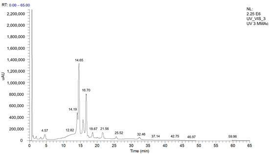 MMEAF was analyzed by UHPLC-DAD-ESI-MSn, and the chromatogram wavelength monitored was set at 254 nm, as it is shown in Figure 1. Two constituents were observed as major compounds, such as that at 14.65 min (λ 258 and 352 nm) (41.76%) and at 16.70 min (λ 266 and 347 nm) (27.02%), with UV spectra characteristic of the benzyl (ring A) and cinnamoyl (ring B; C2-C3) portions, respectively, from flavonoid chemical structures. Minority compounds were also observed in 4.57 and 14.19–25.52 min, also with phenolic absorption characteristics, which will be discussed further in detail.