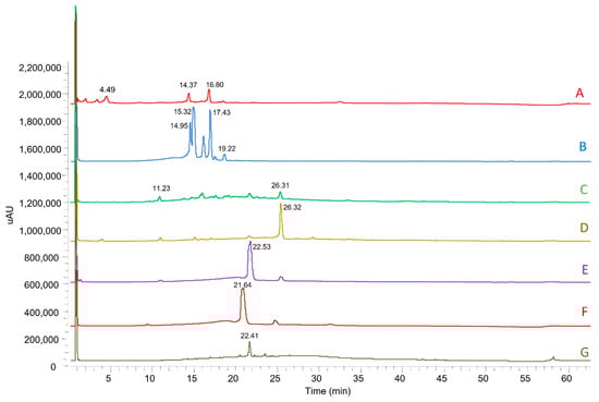 Chromatograms of the subfractions MMEAF-A–G analyzed by UHPLC-DAD-ESI-MSn and monitored at 254 nm.