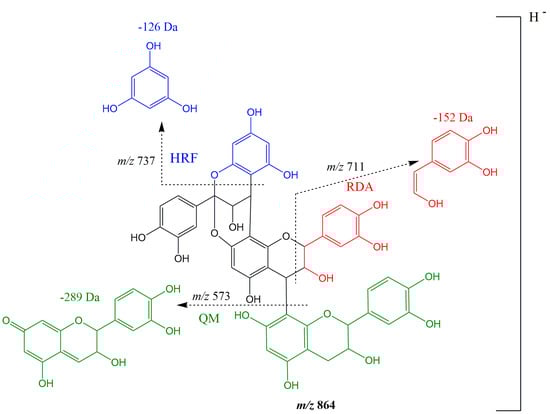 MMEAF-D was subjected to a HPLC-DAD semi-preparative method, as described in the Material and Methods Section, affording an isolated compound with the deprotonated molecular ion m/z 447 [M-H]− detected by UHPLC-DAD-ESI-MS/MS, suggesting the presence of kaempferol (10) (Rt = 26.32 min). From MMEAF-D, a compound with λmax at 280 nm (Rt = 11.21 min) and a deprotonated molecular ion m/z 863 [M-H]− with four main fragment ions at m/z 711, m/z 573, m/z 451, and m/z 289 was identified. This ion was tentatively identified, based on previous data found in the literature, as a procyanidin (PC) (epi)-catechin trimer with a type-A linkage, thus being assigned as an A-type (epi)-catechin trimer (2) (5.5 mg; >95% purity at 254 nm), the same as proposed by [41] by LC-MS/MS analyses. Differently from others, the A-type trimer (ATT) has an extra bond between favan-3-ol units, which links the C-2 of the upper unit to the C-7 of the lower unit. The compound identified in MMEAF-D is likely a PC ATT with 1 A-bond (Figure 4). In general, the dissociation manner of PC polymers is similar to the dimers, but, in the case of ATT, it has two types of fragmentation patterns. For PC ATT, the quinone methide (QM) fission cleavage ions are present at m/z 289 ([MB-H (290-H)]−, QM fission at the terminal unit) and m/z 573 [M-290-H)]−, that produces the fragment m/z 451 [M-290-123((C6H6O3)-3H)]− by heterocyclic ring fusion (HRF). Under this circumstance, the fragment ion at m/z 737 is also formed by HRF of m/z 863 [M-H]− with the loss of 126 Da [M-H-126(C6H6O3)]−, while m/z 711 is formed by retro-Diels–Alder fission (RDAF) of the middle unit, with the loss of 152 Da [M-H-152]− [42].