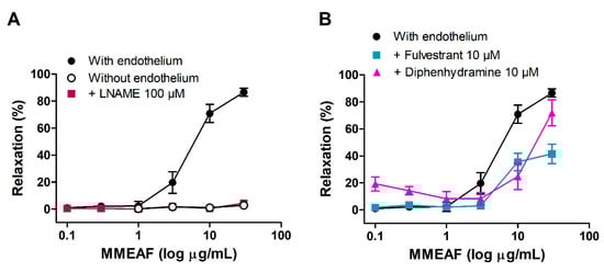 In the presence of L-NAME, the vasodilator effect of MMEAF was completely inhibited, indicating that the effect is dependent on NO release (Figure 5A). The involvement of histamine H1 and estrogen receptors in the activation of NO production was investigated through the pretreatment of aortic rings with diphenhydramine and fulvestrant, respectively. In the presence of diphenhydramine, the maximal effect of MMEAF was reduced to 51.33 ± 4.87% relaxation, and EC50 was increased to 26.41 ± 4.45 μg/mL (p < 0.05; Figure 5B). Pretreatment with fulvestrant did not alter maximal vasodilator response but induced a rightward displacement of the concentration–response curve of MMEAF, increasing EC50 to 13.94 ± 3.44 μg/mL (p < 0.05; Figure 5B).