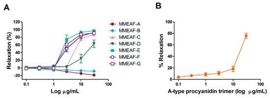The vasodilator effect of the A-type procyanidin trimer identified in subfractions C, D, and E was also evaluated. This compound induced a concentration-dependent relaxation of aorta with endothelium, with maximal relaxation of 75.77 ± 4.39% (Figure 6B; Table 2). As can be seen in Table 2, the isolated compound presented a greater maximal effect than MMEAF-D, but not statistically different from MMEAF-C and E. In contrast, the trimer was less potent than these two subfractions, suggesting that quercetin especially contributes to the higher potency of MMEAF-E, possibly through additive/synergistic actions with the trimer and other compounds.