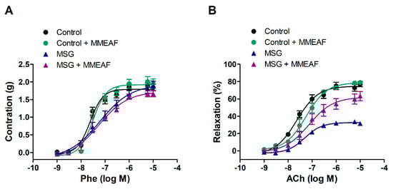 Obesity was induced in male Wistar rats through subcutaneous injections of MSG (4 g/kg body weight: MSG group) during the first 5 days of life. Control (CTL) group received hyperosmotic saline solution (1.25 g/kg body weight). Body weight and food intake were determined once a week. After euthanasia, perigonadal and retroperitoneal fat pads were collected and weighed. Obesity was confirmed by the increase in fat stores, despite the reduction in body weight, as described in our previous publications where MSG-induced obesity was used [34,35]. All MSG rats used in this study presented these characteristics. The thoracic aorta was dissected and prepared for isometric tension recording, as previously described in Section 2.8. In order to evaluate vascular reactivity, concentration–response curves for Phe (10−9–10−5 M) and ACh (10−9–10−5 M) were obtained in the absence and presence of 3 μg/mL of MMEAF. EC50 was calculated by non-linear regression analysis and expressed as pEC50 (negative log EC50 in Molar).