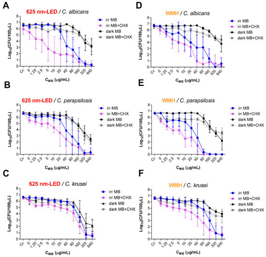 In the absence of photosensitizer and irradiation, the tested concentration of CHX (10 µg/mL) (MB−/CHX+/light−) (dark MB-CHX with the value of 0 MB concentration in Figure 1) failed to effectively inactivate the yeast. A maximum reduction of 1 log10 was observed against C. parapsilosis.