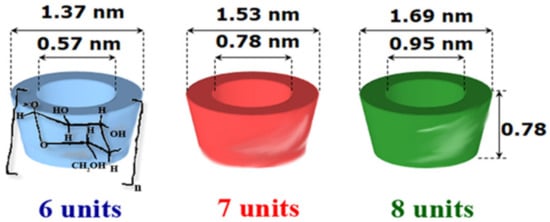 CDs are cyclic oligosaccharides consisting of at least six (α-1,4)-linked D-glucopyranose units [3]. Native CDs used are α-CD, β-CD and γ-CD, consisting of six, seven, and eight glucopyranose units, respectively (Figure 1). If steric hindrances prevent the formation of CDs with less than six glucopyranose units, CDs with more than eight glycosidic units, commonly referred to as large-ring CDs (δ-CD, ε-CD, ι-CD, and η-CD), are difficult to produce and are not suitable to form inclusion complexes [4]. CDs have a typical truncated cone shape, in which the secondary hydroxyl groups (C2 and C3 carbon atoms of the glucose units) are located at the wider end of the cavity, and the primary hydroxyl groups (C6 carbon atoms of the glucose units) at the other narrower one (Figure 1). The presence of the hydroxyl groups on the edges of the truncated cone is responsible for the hydrophilic character of the CDs and their solubility in the aqueous medium. The presence of hydrogen atoms and glycosidic oxygen bridges in the internal cavity of CDs are responsible for the lipophilic character, enabling them to form inclusion complexes with hydrophobic molecules of proper dimensions [5].