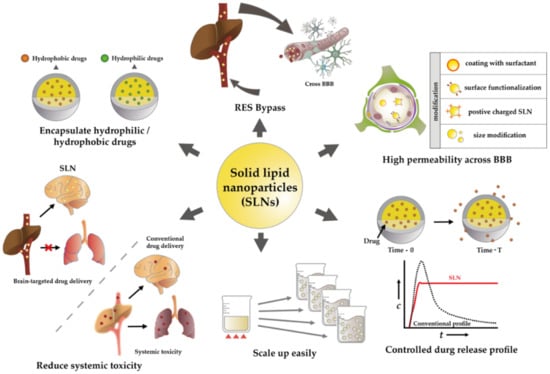 Highlighting the utilities of SLNs and their modifications such as: encapsulation of hydrophilic and lipophilic drugs, capable to cross the BBB for target specific drug delivery due to their unique physicochemical nature, can bypass RES system, reduce systemic toxicity, sustained or controlled drug release in a time dependent manner, and can be scaled up in a cost-effective way.