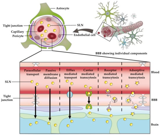 It is necessary to understand the different pathways through which the biological and pharmaceutical active components can cross the BBB (Figure 4). The detailed transportation mechanisms of each pathway are briefly described to obtain a general idea of how the active pharmaceutical components, with the help of a carrier system can cross the BBB to reach the brain. Although many strategies have been developed to nonspecifically disrupt the BBB, allowing the pharmaceutical agents to enter into the brain, these may also allow circulating toxins enter the brain from the blood, causing severe neuro toxicity. There is a need for an ideal and safe approach by which we can improve the brain permeability of the drugs in a target-specific and sustained-release manner, without disrupting the BBB. Recent SLNs, and the modifications in drug delivery for the treatment of neurological disorders, are very promising biomaterials in the context of BBB-targeted drug delivery.