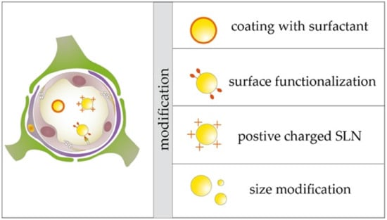 There are various characteristic features which can be modified to improve the quality of the SLNs. For example, the SLNs loaded with drugs such as paclitaxel, vinblastine, camptothecin, etoposide, and cyclosporine (hydrophilic drugs) [41,49,73,97], due to their unique size, surface hydrophobicity, and surface mobility, can cross the BBB. However, those drugs may have shown limitations in their pharmacokinetics, resulting in poor pharmacological activity and therapeutic efficacy. The reason for this is their detection by the reticuloendothelial system (RES). Recent research has focused on how to improve the shortcomings associated with SLNs. Some of the approaches used are briefly described here (Figure 5).