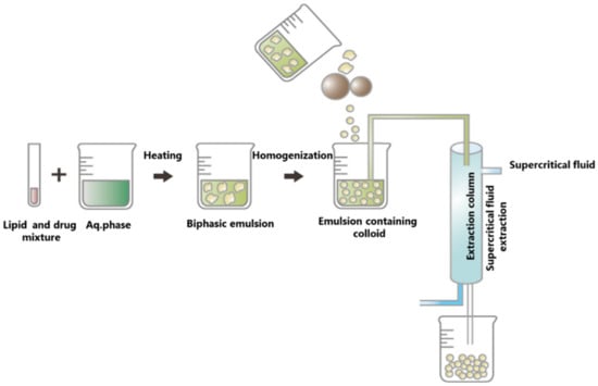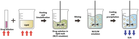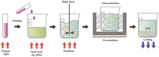 Hot homogenization is the process (Figure 8) of emulsion formation from lipids where, a high temperature (above melting point) is required to homogenize the lipid. During this process, a pre-emulsion (containing the drug and lipid mixture) is melted to obtain the aqueous emulsion by high-shear mixer. Then, this is cooled to obtain crystalized lipid SLNs as the final product. The final SLNs’ emulsion size and properties are dependent on the pre-emulsion contents and surfactant used. Microparticles are usually obtained during this process. However, at higher processing temperatures lower particle sizes are obtained, due to the reduced viscosity of the lipid phase at high temperatures [175]. High temperatures may be responsible for degradation of the drug and carrier substance, forming a limitation of this process [176].