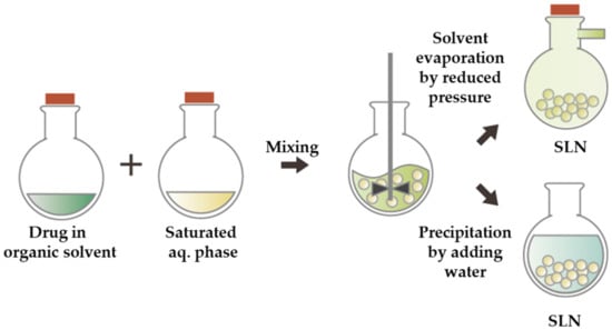 During this process (Figure 9), a uniform lipid solution is prepared with a suitable organic solvent. Then water is added to this lipid solution to form an o/w coarse emulsion using a high-speed homogenizer. Then, a high-pressure homogenizer is used to obtain nano-emulsion of the solution mixture containing globules of a larger size. Then, from the nano-emulsion, the SLNs can be separated by continuous stirring overnight and separation of the organic solvent. After this, the lipid precipitate recovering in an aqueous solution is filtered to obtain the final SLNs, with a particle size of around 25 nm [178].