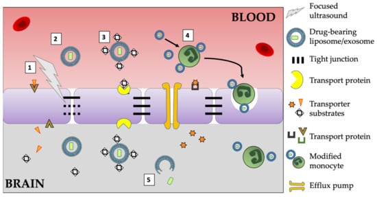 Common routes of nanomedicines targeting brain tumor drug delivery. A schematic diagram (not to scale) shows four main routes by which nanocarriers improve drug delivery to the brain parenchyma. 1. Focused ultrasound weakens endothelial tight junctions and improves uptake of nanocarriers. 2. Liposome passage through the intact BBB occurs, but only at low rates. Exosomes show higher penetration. Both may be enhanced by leaky tumor vasculature known as the enhanced permeability and retention (EPR) effect. 3. Liposomes can be modified with transporter substrates such as glucose, transferrin or glutathione to improve BBB crossing. 4. Liposomes targeting circulating cells capable of BBB penetration, known as the “Trojan Horse” approach. 5. Drugs must eventually leave the liposome in order to act on their targets. However, efflux pumps are capable of removing many drugs from the brain parenchyma.