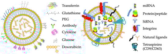 Extracellular vesicles (EVs) are naturally occurring, nanoscale membrane-bound vesicles secreted by cells. The term “extracellular vesicles” encompasses microvesicles (100–1000 nm), exosomes (30–150 nm) and apoptotic bodies (50–5000 nm) which each vary based on their content, function and biogenesis []. Human body fluids are rich in EVs which serve as a means of communication between distant tissues []. EVs in the blood may also originate from platelets and the bacterial microbiome []. Since exosomes are formed by budding off from cell membranes, they have highly complex compositions, varying by lipid and cholesterol makeup, protein content and protein modifications. Therefore, exosomes have the inherent ability to bind and interact with specific target cell receptors, which is an advantage over most synthetic nanomedicines []. A schematic showing exosome structure and a comparison to liposome structure is shown in Figure 2.