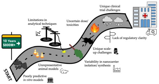 For successful clinical translation, any nanotechnology-based approach needs to be safe and must offer benefits above and beyond the current standard of care. As of mid-2021 there are less than 25 nano-based drugs commercially available for cancer treatment—the vast majority being liposomal formulations of older chemotherapeutic agents such as Doxorubicin, Paclitaxel and Daunorubicin []. This is highly disproportionate to the large numbers of early clinical trials and the decades of research funding and publications in the nanomedicine field []. In the brain drug delivery field, the ratio is even poorer. A schematic illustrating some of these obstacles is shown in Figure 3.