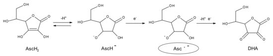 Levine et al. [5] hypothesized that in the interstitial space of the tumor, AA is led to form its radical (Asc •) starting its mono anionic form (AscH−). This reaction (Reaction 1) occurs mainly in extracellular tissues where suitable metal catalysts are present, while in the blood, these reactions are reduced to a minimum.