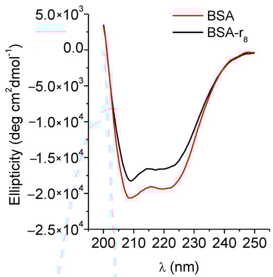 Circular dichroism spectrum of BSA before and after r8 functionalization. DOL: 2.4 r8/BSA. BSA and BSA-r8 1.5 × 10−5 M samples were prepared in PBS.