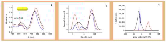 Characterization of BSA-A565-r8 capped AuNRs: red line, AuNRs, black line AuNR-BSA, blue line AuNR-BSA-A565-r8. (a) UV-Vis NIR spectra. The red arrow shows the presence of Atto-565. (b) Size distribution. (c) Zeta potential distribution. Acquired in PBS, pH = 7.