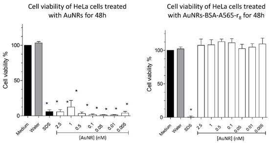 Effect of AuNRs and AuNR-BSA-r8 incubated for 24 h on cell viability of HeLa cells at 48 h. The average values for n = 4 experiments are shown with error bars representing the SEM. * Significant difference according to Tukey’s test p < 0.05 compared to medium control.