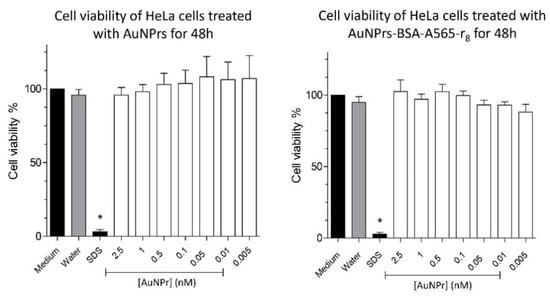 AuNPrs were functionalized with PEG-COOH to increase their colloidal stability [86] and subsequently coated with BSA-A565-r8 (AuNPr-BSA-A565-r8). Figure 5 shows cell viability of HeLa cells treated with AuNPrs and AuNPr-BSA-A565-r8 at the 0.005–2.5 nM range. As expected, neither AuNPrs nor AuNPrs-BSA-r8 showed any effect on HeLa cell viability after 48 h of treatment by MTS assay. Flow cytometry also showed non-effect of AuNPrs-BSA-r8 1 nM in the HeLa cells after 24 h of incubation (Supplementary Section 5, Figure S6). This null effect on cell viability of AuNPrs was previously demonstrated in studies such as those of Alfranca et al. and Bao et al., using Vero cells and HT-29 cells at 72 h, respectively [29,87]