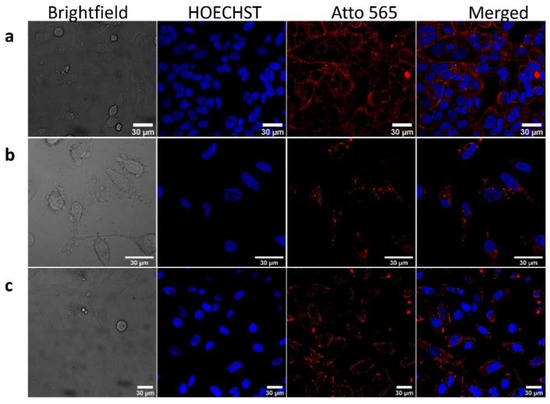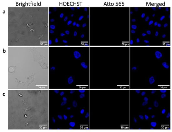 Confocal microscopy images of HeLa cells after treatment with: (a) BSA-r8-A565, (b) AuNR-BSA-r8-A565, (c) AuNPr-BSA-r8-A565 incubated for 24 h. Scale 30 µm. [BSA-r8] = 5 µM, [AuNR-BSA-A565-r8 and AuNPr-A565-BSA-r8] = 1 nM. Channels: bright blue (HOECHST), red (Atto-565), blue and red (merged).
