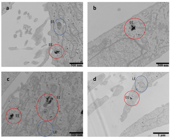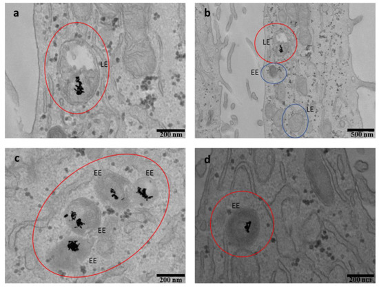 TEM images of HeLa cells after treatment with AuNR-BSA-r8 incubated for 24 h (a–d). Red circles show the internalized AuNPs. EE: early endosomes and LE: late endosomes. Blue circles showing examples of vacant LE or EE.