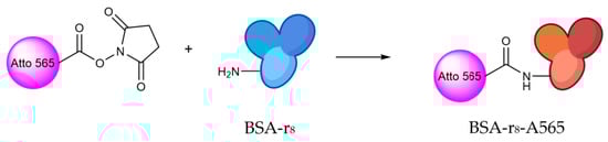 Fluorescent labeling of BSA was conducted as represented in Scheme 2. To 10 mg of BSA-r8 of the previous step, 10.7 µL of a 10 mg/mL solution of Atto 565 NHS ester was added and allowed to react for 1 h. The final product (BSA-r8-A565) was purified with a P10 G25 desalting column and characterized by UV-Vis spectroscopy.