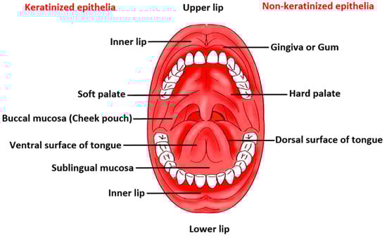 The anatomy and physiology of the oral mucosa covering a total area of 170 cm2 reveals three distinctive layers, namely epithelium, lamina propria, and submucosa. The protective buccal epithelial membrane is divided into flexible non-keratinized mucosal surface lining the soft palate, ventral surface of the tongue, sublingual mucosa, floor of the oral cavity, inner lips, and buccal pouch, and keratinized mucosa, which covers the hard palate, gingiva and dorsal surface of tongue in the oral cavity [9]. A schematic diagram displaying key regions of the buccal area is given in Figure 1. There are several text and reference books available that extensively reviews the main anatomical and physiological aspects of the oral cavity, teeth, tongue, salivary glands and orofacial muscles [10,11,12]. A summary of buccal mucosa and oral environment as a barrier for drug permeation/penetration are described henceforth.