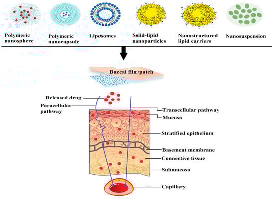 Nanocarriers are effective drug transport agents due to the possession of submicron particle size and unique physicochemical properties which would enable them to deliver to targeted tissues. They are versatile particulate, soluble or target-specific recognition moiety carrier systems capable of loading a diverse range of drugs prepared using different types of polymers and various manufacturing techniques. The use of nano-drug carriers can circumvent many limitations typically related to buccal drug delivery. Indeed, nanocarriers have many advantages such as enhanced diffusion coefficient of the drug through the mucosal epithelial layers, stability of the drug against degradation in buccal environment, prolonged contact time with the mucosa, extended buccal residence time by mucoadhesion, allowing for therapeutic concentration at the target site as well as decrease in the severity of the undesirable side effects [123]. Moreover, nanocarriers may minimize oral clearance, sustain or control the drug release, which decreases the frequency of administration and improves patient compliance. The composition of carrier as well as the entrapping agent determines the overall permeability, release rate, mucoadhesion to buccal epithelium and targeting ability. An ideal nanoparticulate carrier system must be capable of retaining close contact with the mucosa, thus allowing permeation enhancement of the actives without affecting the overall stability. Nanocarriers are generally formulated as aqueous dispersion or embedded within the matrix of the gel or film. Frequently used polymeric and lipid nanoparticles for buccal delivery and their characteristics are displayed in Table 4. An illustration exhibiting the transport of various types of nanoparticles via buccal mucosa is shown (Figure 4).
