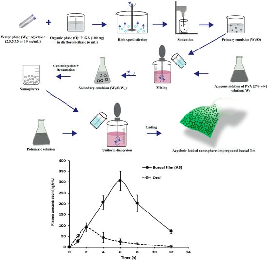 Stimuli-responsive mucoadhesive hydrogels are an impressive choice for buccal therapy as they can modulate the drug release based on the response to external environmental changes and subsequent changes in structure, swelling capacity, diffusion or mechanical strength. The stability of susceptible drugs in the oral environment was improved by employing cationic hydrogel polymers such as chitosan [143]. The pH sensitive hydrogel with remarkable swelling characteristics was also observed with most frequently used synthetic polymers, acrylamide and methacrylic acid [144]. A major limitation identified with nanoparticles is uncontrollable and inconsistent initial burst effect, which induces huge loss of drug resulting in subtherapeutic drug concentration. This is mainly contributed by factors such as weakly bound actives, relocation towards the particle surface and complexity of the heterogeneous nano-matrix [145]. This behavior can be minimized to a certain extent by either particle-coating or matrix reformulation; however, it may change nanoparticle physical and chemical properties. The loading of carvedilol in bioadhesive gelatin nanoparticles and further incorporating in bioadhesive gel constituted of HPMC and NaCMC was found to decrease burst effect and significantly improved relative bioavailability through mucosal delivery compared to marketed product. The enhancement in the bioavailability could be possibly because of increase in drug solubility contributed by nanoparticles and avoidance of hepatic first pass effect. Ex vivo permeation investigations with excised rabbit mucosal membrane indicated that acyclovir nanospheres incorporated in matrix buccal film were effective in crossing the epithelial barrier [146]. It was demonstrated that Cmax, AUC, and tmax enhanced notably with the application of nanoparticles impregnated buccal film compared to buccal film loaded with drug. Acyclovir loaded PLGA nanospheres were prepared by double-emulsion solvent evaporation method and buccal film were fabricated by different concentrations of Eudragit RL 100, HPMC K15 and Carbopol 974P polymers. The acyclovir was rapidly absorbed after oral administration providing a Cmax of 91.61 ± 42.88 ng/mL at 2 h while buccal film provides a maximum concentration of 3116.21 ± 246.37 ng/mL at 6 h. It was reported that buccal delivery markedly improves systemic availability of acyclovir (3116.2 ± 246.4 ng h/mL) as compared to oral solution as control (395.21 ± 64.20 ng h/mL) (p < 0.0001). It was suggested that delayed tmax (6 h) in comparison to 2 h after oral administration could possibly extend the duration of drug action and may decrease the number of drug dosing. A schematic diagram depicting the processing steps and in vivo pharmacokinetic evaluation in rabbits is shown in Figure 5.