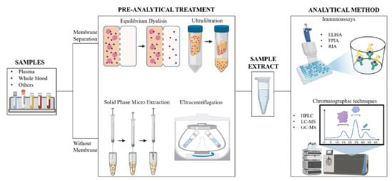 Free drug analysis involves the separation of bound and unbound drug, achieved through various methods briefly summarized in this paragraph, followed by an appropriate detection and quantification approach; this latter is selected considering molecules’ chemical nature and the type of matrix analyzed, and mainly involves chromatography or immunoassays [39] (Figure 2).