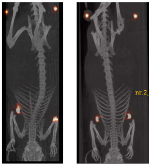 µPet/CT superimposed images of two adult female rats, 40 h after the injection of 64Cu-HAC in the mammary glands. In the upper part of the images, near hind legs, two objects with high density and imbibed with 64Cu are located as reference points for accurate overlapping of PET and CT images. Reproduced from [28] under a Creative Commons Attribution 4.0 International License (http://creativecommons.org/licenses/by/4.0/).