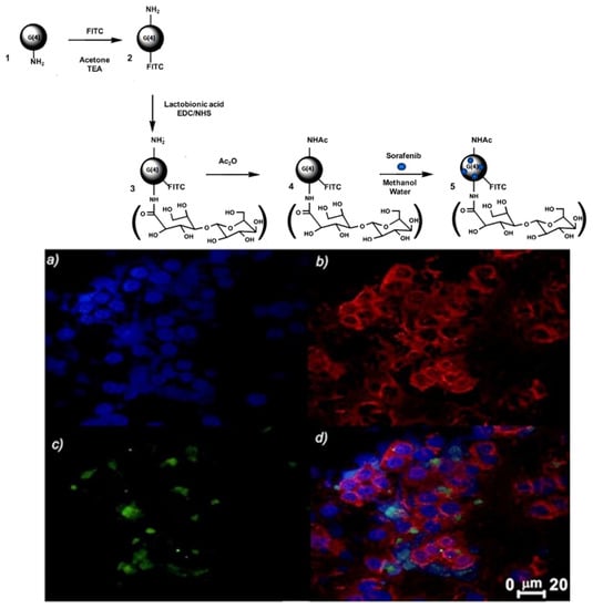 Upper panel shows the scheme of the synthesis of G(4)-PAMAM-FITC (2), Ac-La-G(4)-PAMAM-FITC (4), and Ac-La-G(4)-PAMAM-FITC/sorafenib (5) dendrimers; bottom panel shows representative single confocal slices of fixed HepG-2 cells: HepG-2 cells imaged with (a) DAPI; (b) Phalloidin-TRITC; (c) Ac-La-G(4)-PAMAM-FITC 4; (d) overlay after an incubation period of 15 min. Bar: 25 μm. Adapted with permission [32]. Copyright 2017, Elsevier B.V.