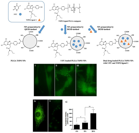 Upper panel shows a schematic representation of PLGA-TSPO NPs; bottom panel shows the fluorescence microscopy images: cells were seeded onto 24 mm coverslips and treated at 37 °C in a 5% CO2 atmosphere with 0.2 μM FITC−TSPO NPs (concentration is referred to FITC). Internalized FITC fluorescence was acquired after 4 (i), 8 (ii), and 24 h (iii). Cells incubated with 25 nM MitoTracker Red CMXRos (iv) and cells treatment with FITC (7 μM) alone after 24 h (v) were used as the control. Average intensity of internalized fluorescence of treated cells as imaged after 4, 8, and 24 h of incubation (vi). Data are given as means ± SD (bars) for five separate cultures. The statistical significance of differences was calculated by the unpaired Student’s t test with Bonferroni’s correction. * p < 0.05, ** p < 0.005. Adapted with permission [34]. Copyright © 2021 American Chemical Society.