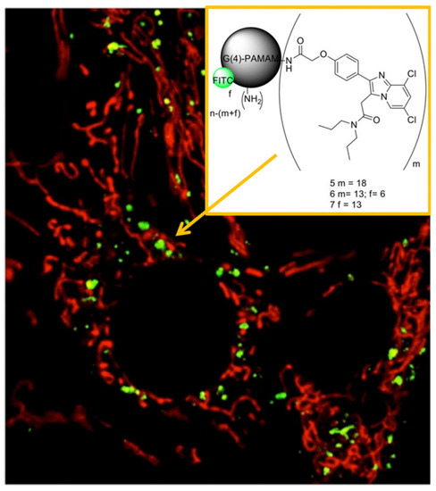 Reflecting the need for advancements in personalized medicine, some researchers also developed nanocarriers targeted to mitochondria [124,125,126,127] and useful as appropriate probes to image diseases or biological processes involving these intracellular organelles and, in particular, an interesting mitochondrial biomarker, the already mentioned TSPO protein. Variations in TSPO expression levels have been related to different diseases, from tumor to endocrine and neurological disorders; thus, this receptor has become an appealing subcellular target for the early diagnosis of a disease involving its overexpression. Targeting mitochondria is a hard and challenging task due to their highly complex structure; for this reason, the researchers of the pharmaceutical technology group of the University of Bari synthesized selective TSPO ligands having groups potentially derivatizable and therefore ideal for the preparation of targeted nanocarriers able to deliver therapeutics and diagnostics to mitochondria [62,128].