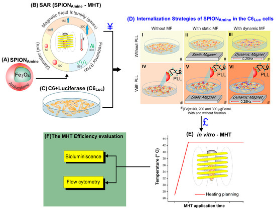 Experimental design. The first stage (A–C): (A) Aminosilane-coated SPION; (B) Calculation of the SPIONAmine SAR according to magnetic field intensity, frequency, and SPIONAmine diameter; (C) C6 cells after transfection of luciferase and (¥) Selection of the SPIONAmine with the best SAR value. The second stage: (D) Internalization strategies (I–VI) of the SPIONAmine into the C6 cells in (#) three different concentrations (100, 200, and 300 µgFe/mL), with and without filtration, and also with and without magnetic field (static or dynamic) and combined or not with poly-L-lysine (PLL) transfection agent; (£) Selection the C6 cell labeled with SPIONAmine resulting from the best strategy of internalization. The third stage: (E) MHT assay in vitro. The fourth stage: (F) evaluation of MHT therapy efficiency.