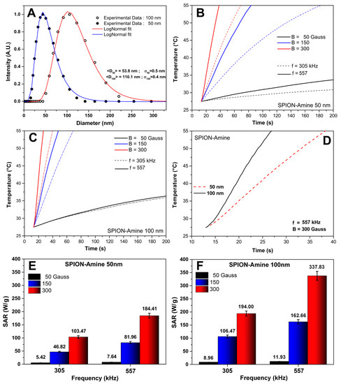 Evaluation of the SPIONAmine 50 and 100 nm features for MHT: (A) SPIONAmine size distribution characterization by DLS, SPIONAmine of 50 nm (blue) and 100 nm (red); (B,C) Heating curves acquired using the following values of magnetic field: 50 Gauss (black), 150 Gauss (blue), and 300 Gauss (red) curves combined with the frequencies 305 kHz (dashed line) and 557 kHz (continuous line); (D) Heating curves of SPIONAmine of 50 nm (red dashed line) and 100 nm (back continuous line) in the best condition of magnetic field and frequency; (E,F) Graphic in bars of mean SAR values of the SPIONAmine of 50 nm and 100 nm, respectively, analyzing each one of the three parameters of magnetic field with each frequency.