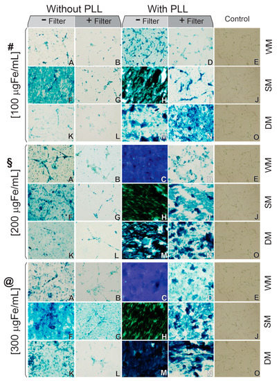 In the three concentrations without PLL (Figure 6A–C, light gray color bars), viability values higher than 94% were observed, but low internalizations were shown by Prussian blue staining (Figure 4(#§@A,F,K) and Figure 4(B,G,L)) compared with images that used PLL (Figure 4(#§@C,H,M) and Figure 4(D,I,N)).