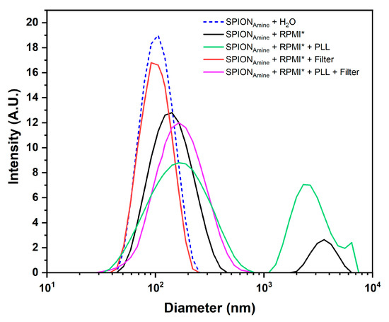 SPIONAmine resuspended in RPMI displayed increased hydrodynamic diameter mean (from 110.2 to 141.1 nm) and a second peak of the mean diameter of 3.60 µm (back curve of Figure 5), which may correspond to a formation of SPION clusters caused by the influence of electrolytes, proteins, and lipids contained in RPMI, as evidenced in the optical microscopy images in the first column of Figure 4.