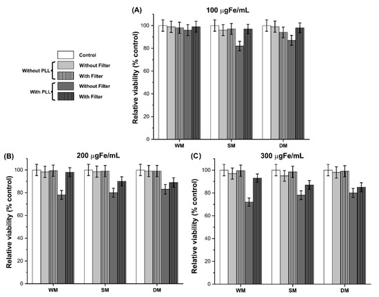 C6Luc labeling process with 200 μgFe/mL, the viability was maintained over 98% without PLL (Figure 6B, light gray bars). However, for samples with PLL without filter, the viability was ~80% (Figure 6B, dark gray bars without vertical lines). Similar behavior occurred for 300 μgFe/mL concentration, which showed viability values over 93% for samples without PLL (Figure 6C, light gray bars), and ~75% for samples with PLL and without filter (Figure 6C, dark gray bars without vertical lines).