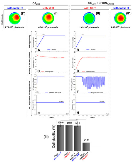 C6Luc labeled with SPIONAmine submitted to MHT (Figure 7II) with the same parameters describe above by 40 min (Figure 7B,D,F,H) showed a fast increase in temperature until achieving 44 °C and maintenance of therapeutic temperature, as shown in Figure 7D, resulting in the BLI signal of 1.46 × 109 photons/s and a reduction of 65.6% in cellular viability compared to the control C6Luc labeled with SPIONAmine without MHT (Figure 7II*) which the BLI signal was 4.67 × 109 photons/s and the cellular viability was 97.5%.