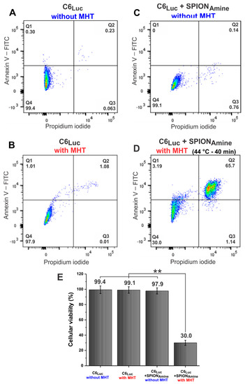 C6Luc cells viability analysis by flow cytometry. (A) C6Luc without MHT application; (B) C6Luc submitted to MHT; (C) C6Luc labeled with 100 μgFe/mL SPIONAmine without MHT application; (D) C6Luc labeled with 100 μgFe/mL SPIONAmine submitted to MHT at 44 °C; and (E) cell viability in each experimental group. ** p < 0.001 compared with (D) group. Abbreviations: MHT: Magnetic hyperthermia therapy, Luc: Luciferase, min: minutes, SPION: superparamagnetic iron oxide nanoparticles, FITC: Fluorescein isothiocyanate. Q1: early necrotic cells (AnxV+/PI-); Q2: necrotic or late apoptotic cells (AnxV+/PI+); Q3: necrotic cells (AnxV-/PI+); Q4: viable cells (AnxV-/PI-).